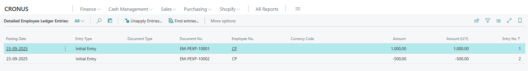 When posted, the sum of the cash (for example $1000) shows in the Amount column of your company's Detailed Employee Ledger Entries. From this point onwards, every time you spend from that original sum and create an expense with the payment type Cash, the sum in the Amount column will reduce. The following example shows the Cash expense type of $500 being deducted from the original Cash Advance amount of $1000.
