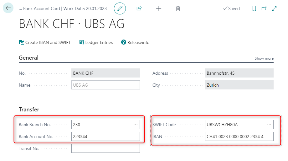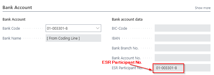 As was already the case when setting up your own bank account numbers, please note that an ESR ID must be set up for the ESR procedure. Likewise, an ESR reference number has to be specified in the open entry. Under these conditions, it is sufficient to specify the ESR ID in the vendor bank account. Bank Branch Code, account number, BIC or IBAN are not necessary.