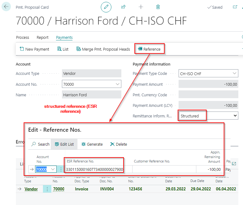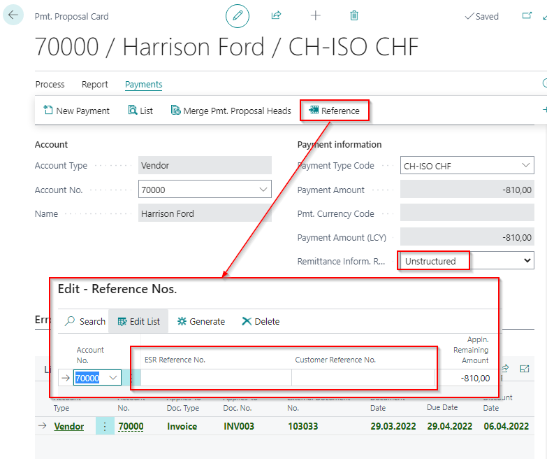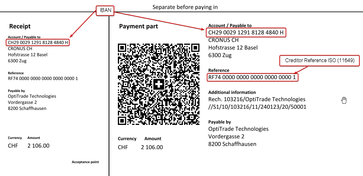Entries in the Customer reference number field are also automatically structured references according to ISO 11649 when using the payment transaction CH.