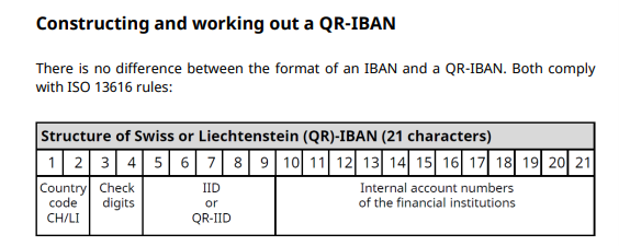 For the QR-IBAN structure, see https://www.paymentstandards.ch/dam/downloads/qr-iid_qr-iban-en.pdf
