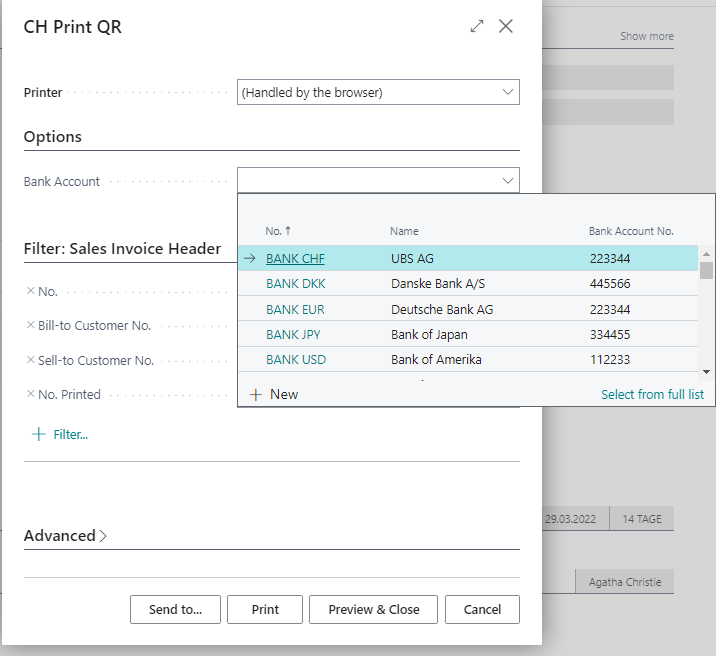 The sales invoice is entered in the usual way. After printing the "normal" invoice, another request page opens to start printing the QR section. The created QR reference is stored in the posted invoice (T112), for this the new standard field Payment Reference (ID 180) is used. The created QR code is stored in the OPplus field QR Code (ID 5157943).