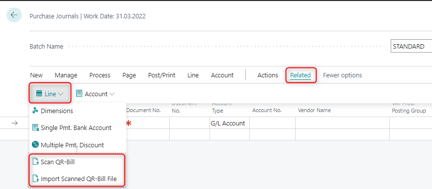 The functions Scan QR Bill and Import Scanned QR Bill File are available in the purchase journals via Related - Line.