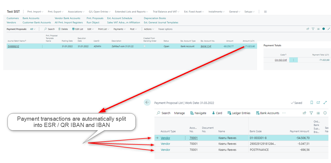 In Switzerland and Liechtenstein, both structured and unstructured references (pupose texts or remittance information) are used. If both vendor open entries with structured and unstructured references are found for a vendor in the payment proposal, a payment header is created for each reference type. If a vendor has open entries with structured and unstructured references for the payment proposal, a payment header is created for each reference type. In the case of payment headers with structured references, one payment line becomes one transaction in the payment file, since only one structured reference per invoice is transmitted to the bank, for example for ESR or QR reference number or ISO 11649 reference.