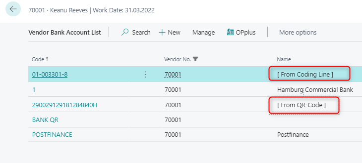 Contains the QR-IBAN of the vendor. When reading in, it is checked whether this is a valid QR-IBAN. If no vendor bank account with this QR-IBAN has yet been created for the vendor, it will now be created. The field Code is filled with the QR-IBAN, without the country code.