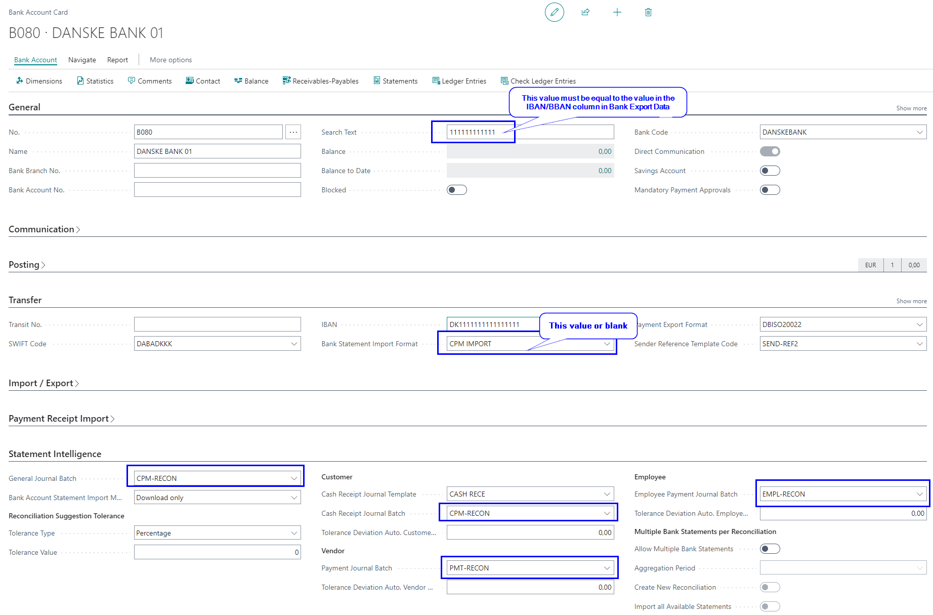 2. Disable Statement Intelligence by navigating to the Bank Account Card, and on the Statement Intelligence FastTab, turn off the Import all Available Statements field.